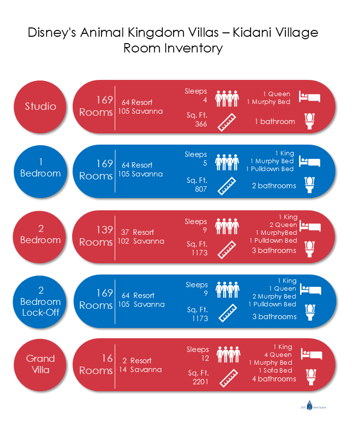 Two-Bedroom Villas are 1,173 square feet and sleep up to nine. Two-Bedroom units at Kidani Village are either lock-off units (made up of connecting Studios and One-Bedroom units) or dedicated units (rooms designed specifically as a Two-Bedroom unit).