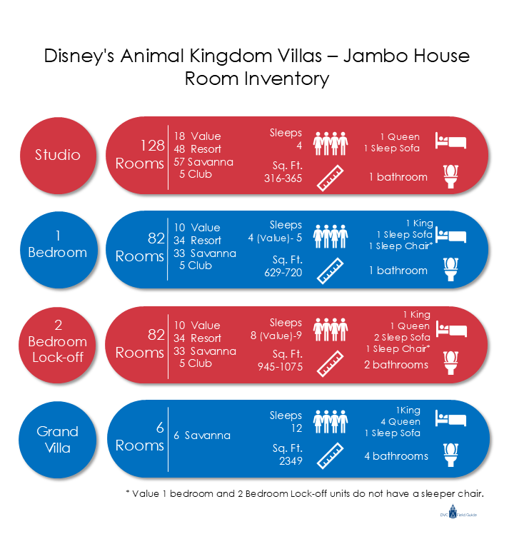 This resort has the most diverse room inventory of any DVC resort. Jambo House accommodations include the “Value” rooms, which have the lowest points for Studio, One-Bedroom, or Two-Bedroom units, of any DVC resort. The lodge is also home to the only concierge-level accommodations across all DVC properties. In general, this resort is well-loved by DVC owners because of its diverse and plentiful room inventory, low initial cost, reasonable annual maintenance, and of course, animal viewing on the many savannas.