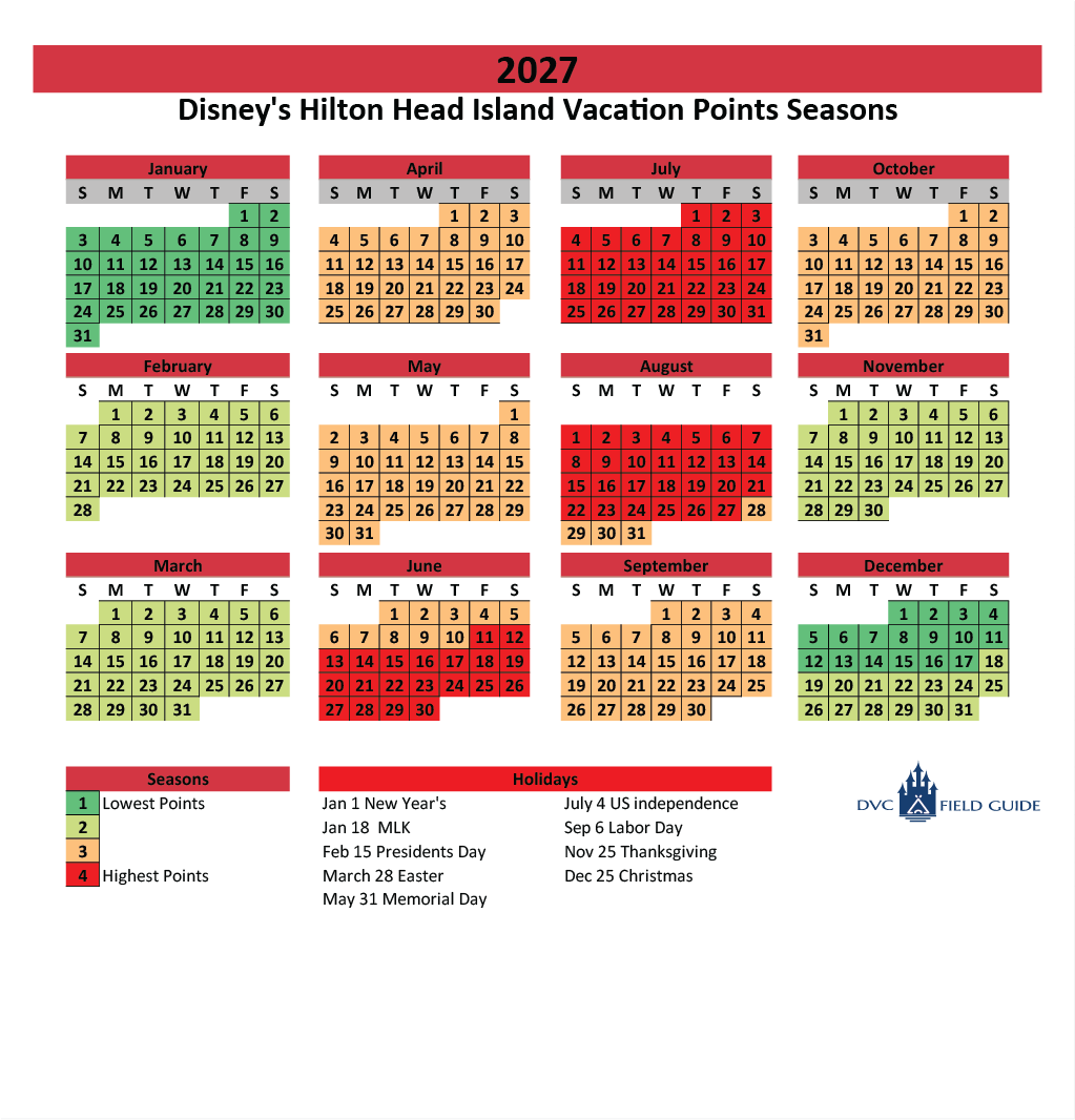 The tables illustrate the average number of consecutive days available for booking a designated accommodation over a week, based on data collected over the past seven years. These availability figures align with what is displayed when searching for a unit on the DVC website. To make the data easily interpretable, a traditional red-and-green light format is used: green indicates the highest availability, while any number less than 7—indicating limited availability—signals caution. A total of seven means that every day of the week is available for booking.