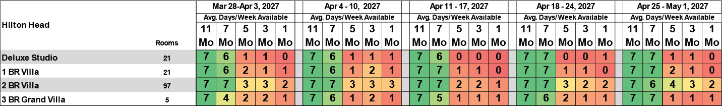Hilton Head Island should have week availability for most studios/Villas at the 11-month windows.