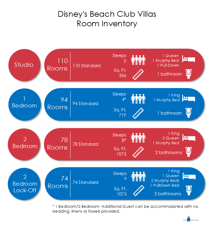 Two-Bedroom Villas are three-room units that sleeps up to nine people. Two-Bedroom units at Beach Club are either lock-off units (these are rooms made up of connecting Studios and One-Bedroom units) or dedicated units. There are 74 lock-off units and 78 dedicated units. These villas are 1,075 square feet.