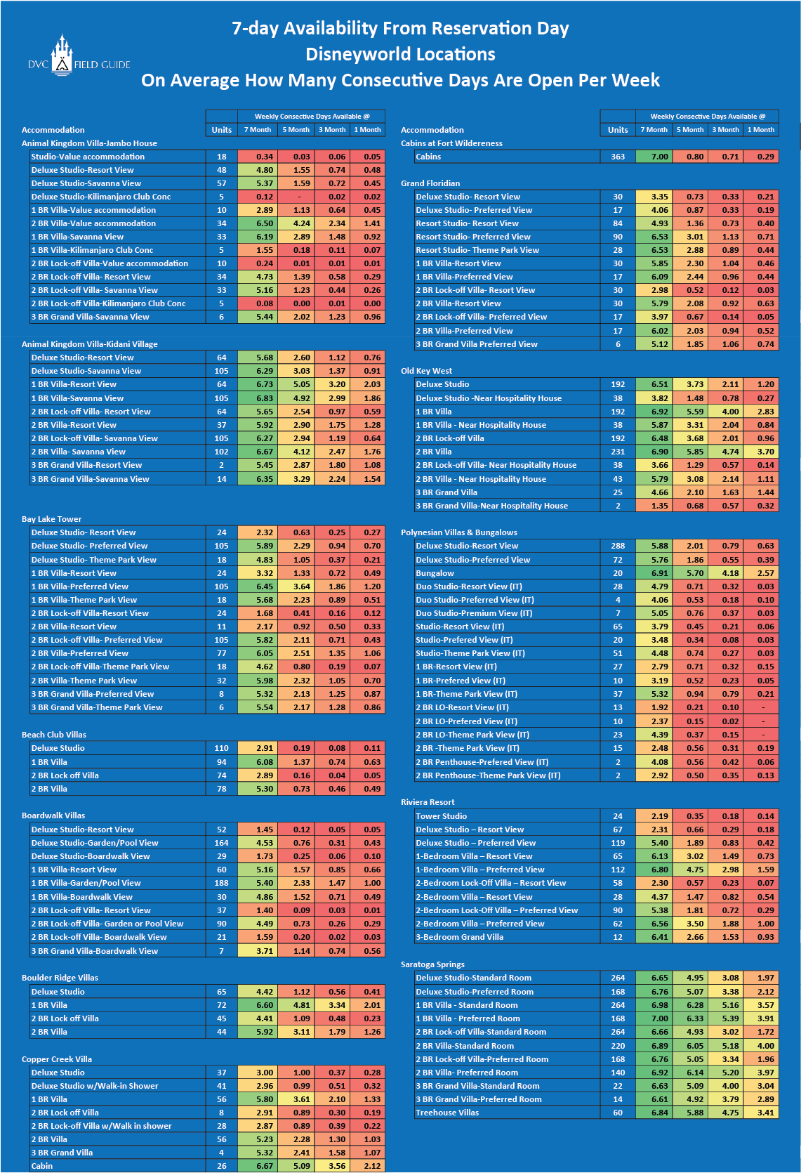 • Some accommodations are in high demand, and snagging a waitlist reservation will be difficult. For example, if you want to stay at Animal Kingdom Villas, the charts tell you that even as the 7-month window opens, the Value and Kilimanjaro Club rooms at Jambo House are filled up. In contrast, the rooms at Kidani Village may have some availability. Knowing this information will help you determine which rooms may be available.