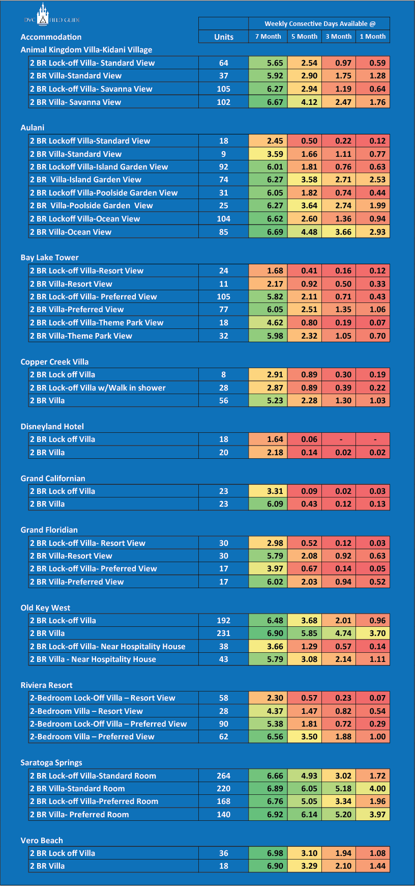 The availability charts take each DVC accommodation and track the availability of a one-week vacation every week of the year. The data is pulled from the DVC reservation website. A snapshot is taken at various times of the year—eleven months, seven months, five months, three months, and one month. A score of 7 is the highest rating. This score means that this accommodation was available every week of the year. On the flip side, a rating of 2 means that, on average, only two consecutive days were available for that week. That doesn't mean every week is that low, but there were only two days on average. Individual accommodation charts are in the back section of the book. Review the data for a more detailed week-by-week evaluation of the individual accommodations.