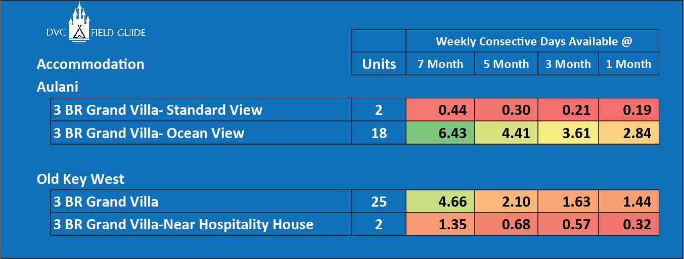 • The room inventory also determines availability for rooms. If there are only a few total accommodations, then the odds of getting on a waitlist will be lower than at a location with several rooms. Take two sites generally with good availability, Aulani and Old Key West. Two of the hardest accommodations to get in DVC are the 3BR Grand Villa-Standard Views at Aulani and the 3BR Grand Villa-Near the Hospitality House at Old Key West. There are only two of these units at each location. If you need a Grand Villa, the likelihood of getting one is much lower than if you chose one of the other Grand Villas types at these locations.