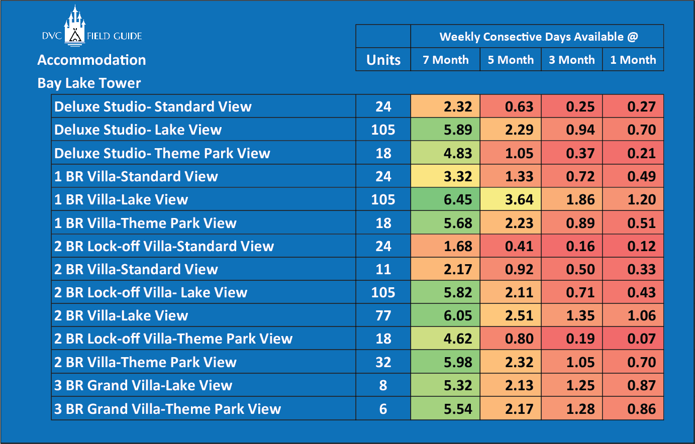 First, look at the availability table below for Bay Lake Tower. Knowing availability can help you determine which accommodations are likely to have vacancies. Choosing less-demanded locations can also help determine the success of your waitlist.