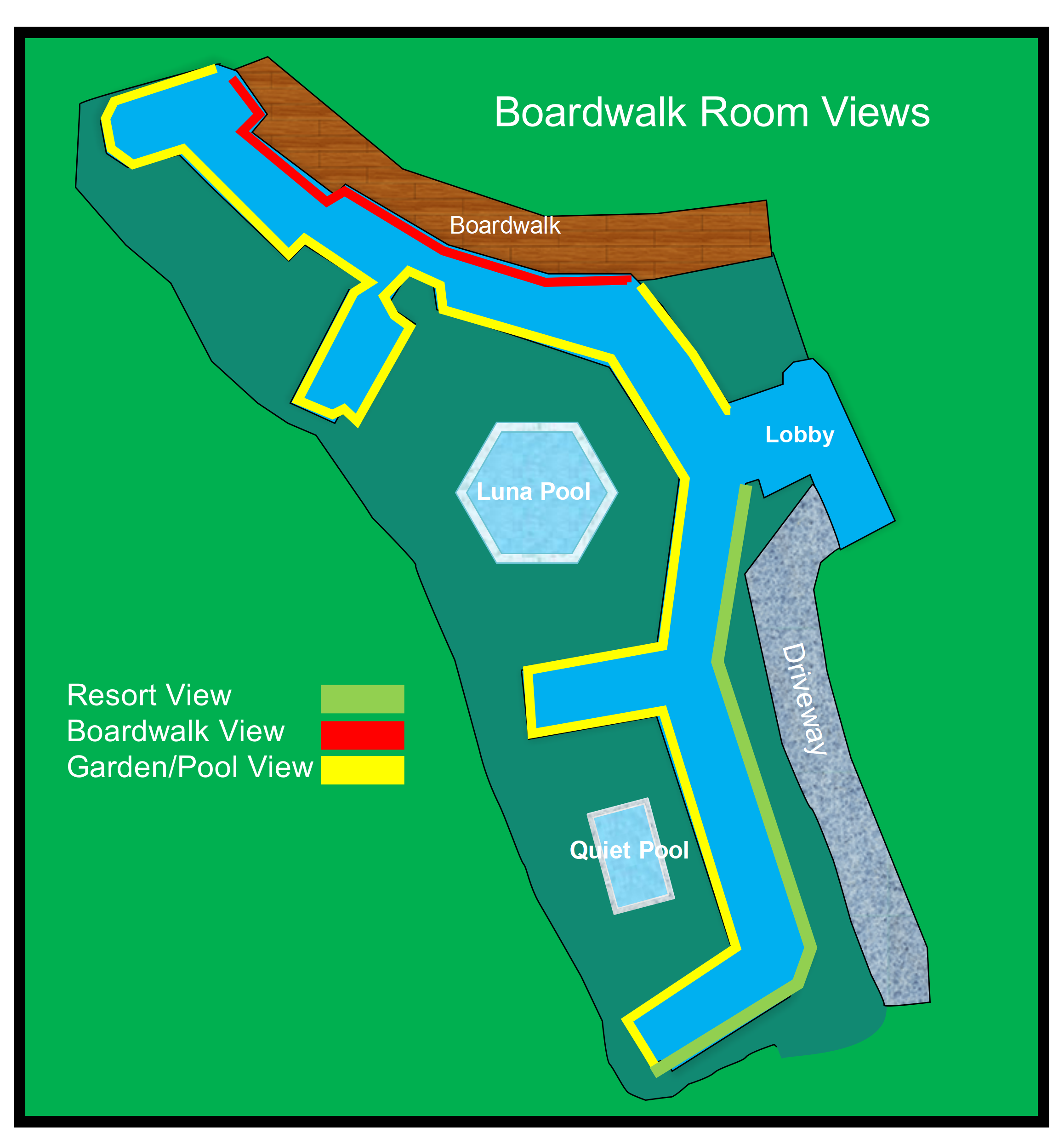 The views at Boardwalk Villas are: Standard View (Views of resort grounds or parking area, and located facing the driveway up to the villa), Boardwalk View (A view of the Boardwalk and Crescent Lake), and Garden/Pool View (pool, water or garden areas.) Boardwalk and Garden/Pool Views require the same number of points, but the views can be booked separately.