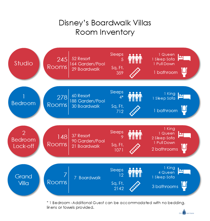 Two-Bedrooms are three-room, lock-off units that sleeps up to nine people. Two-Bedroom units at Boardwalk Villas are all lock-off units (rooms made up by connecting Studios and One-Bedroom units). There are 149 of these units, and they have 1,071 square feet.