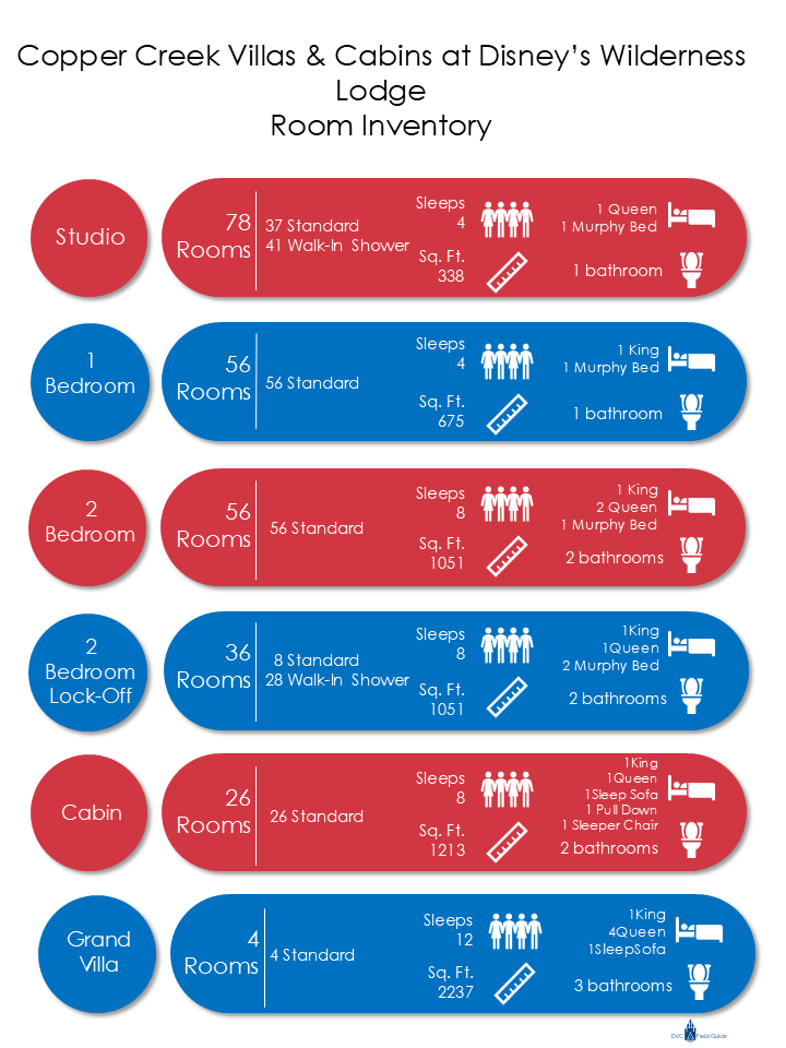 Two-Bedrooms Villas are three-room units that sleep up to eight people. Two-Bedroom units at Copper Creek are either lock-off units (made up of connecting Studios and One-Bedroom units) or dedicated units. There are 36 lock-off units and 56 dedicated units.