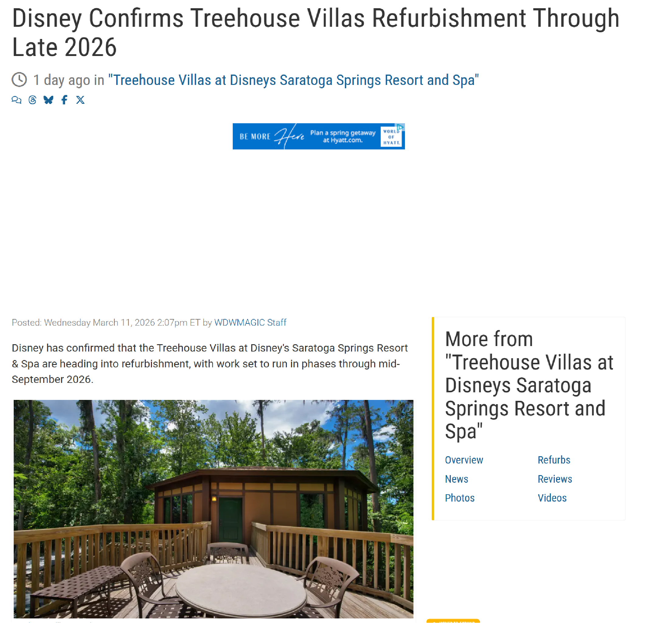 Disney has confirmed that the Treehouse Villas at Disney's Saratoga Springs Resort & Spa are heading into refurbishment, with work set to run in phases through mid-September 2026.