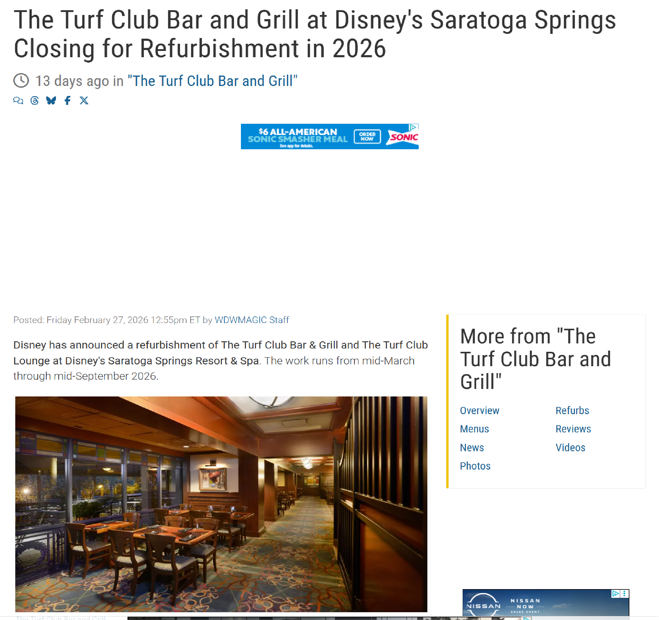 Disney has announced a refurbishment of The Turf Club Bar & Grill and The Turf Club Lounge at Disney's Saratoga Springs Resort & Spa. The work runs from mid-March through mid-September 2026.