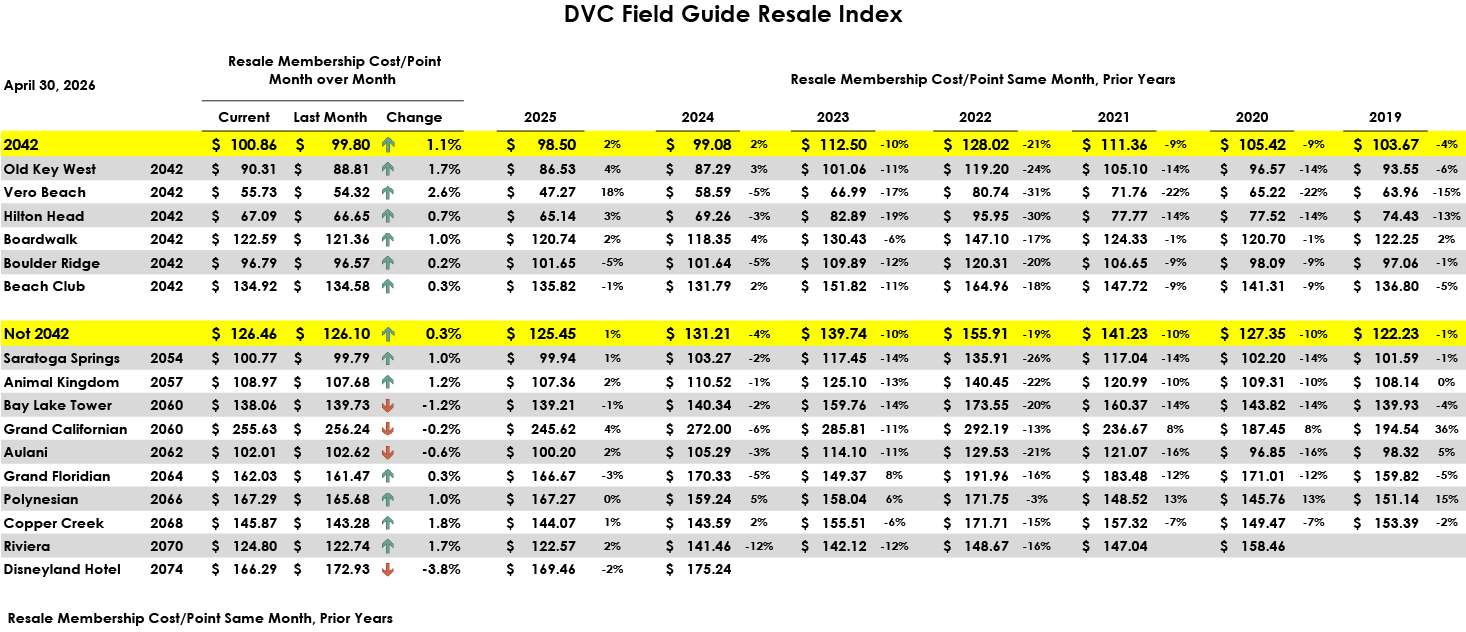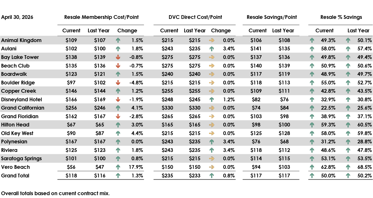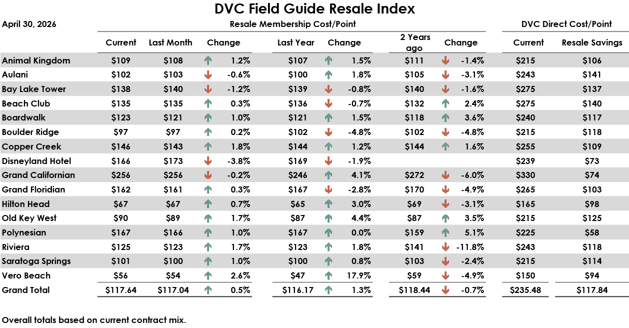 The DVC Field Guide Resale Index tracks resale listings from three major resellers. The Resale Index was up 0.5% from last month. In March, the average price per point in the resale market was $117.64 vs. $117.04 in March. A year ago, the average resale price was $116.17, up 1.3%. Two years ago, the price was $118.44, 0.7% decrease. It is noteworthy 12 of the 16 resorts showed increases over last month. Also compared to last year, 11 of the 16 resorts had price increases. The resale membership cost per point is calculated using the same mix of resort contracts across all periods so the comparison is apples to apples and not skewed toward any resort.