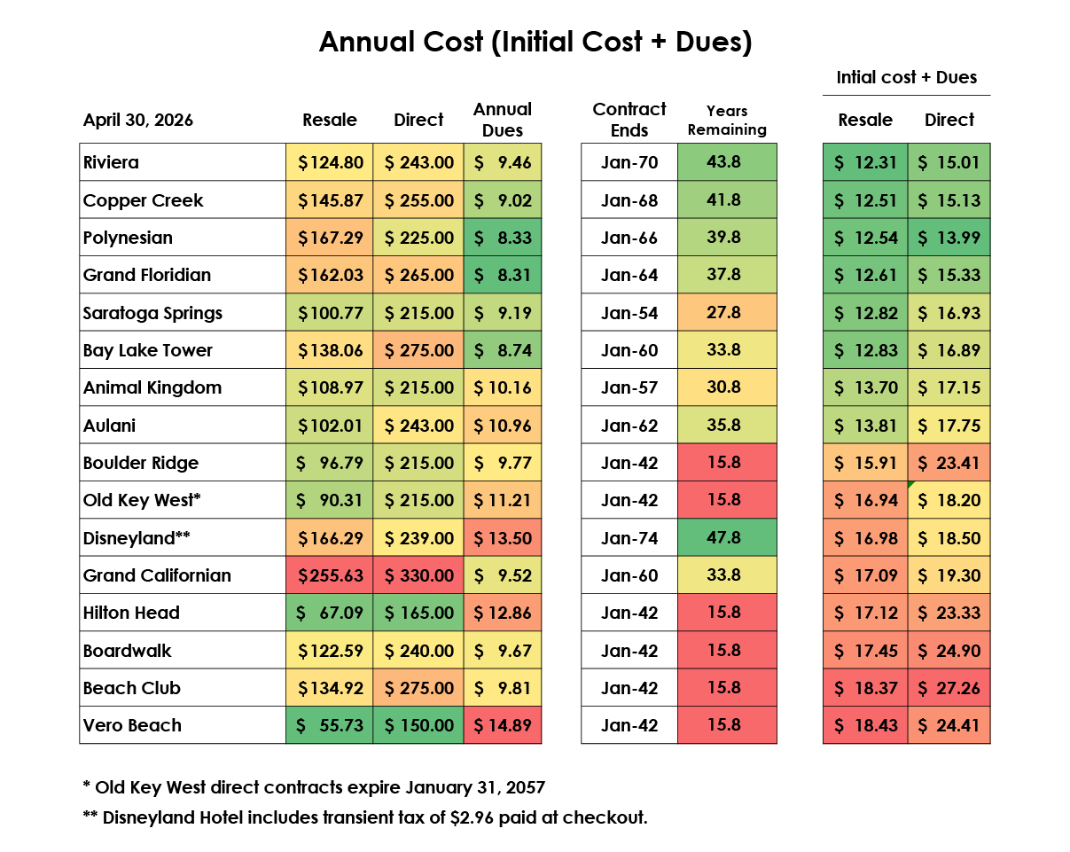 In April, the best resorts for resale purchases, based on total costs (including current pricing, annual dues, and remaining contract time), are Riviera ($12.31 per point), Copper Creek ($12.51 per point), Polynesian (12.54 per point), Grand Floridian (12.61 per point), (Saratoga Springs ($12.82 per point) and Bay Lake Tower ($12.83 per point). On the other hand, the least affordable resorts are Vero Beach ($18.43 per point) and Beach Club ($18.37 per point). For direct Disney purchases, the best option is the Polynesian at $14.45 per point, while the Beach Club is the most expensive at $27.26 per point.