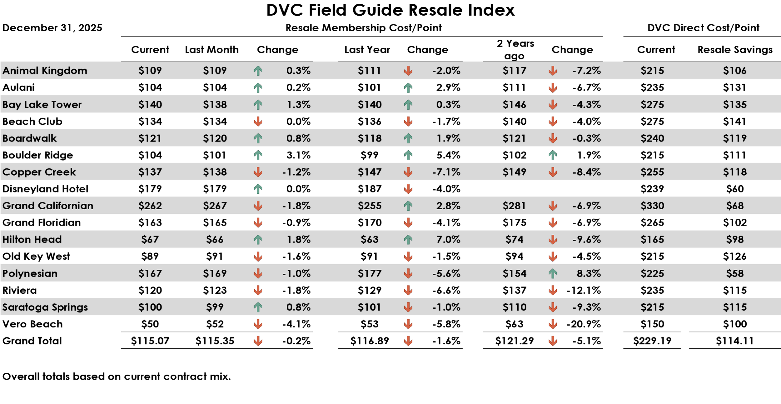The DVC Field Guide Resale Index tracks resale listings from three major resellers. The Resale Index was down 0.2% from last month. In December, the average price per point in the resale market was $115.07 vs. $115.35 in November. A year ago, the average resale price was $116.89, showing a 1.6% decline. Two years ago, the price was $121.29, 5.1% decrease. The resale membership cost per point is calculated using the same mix of resort contracts for each period.