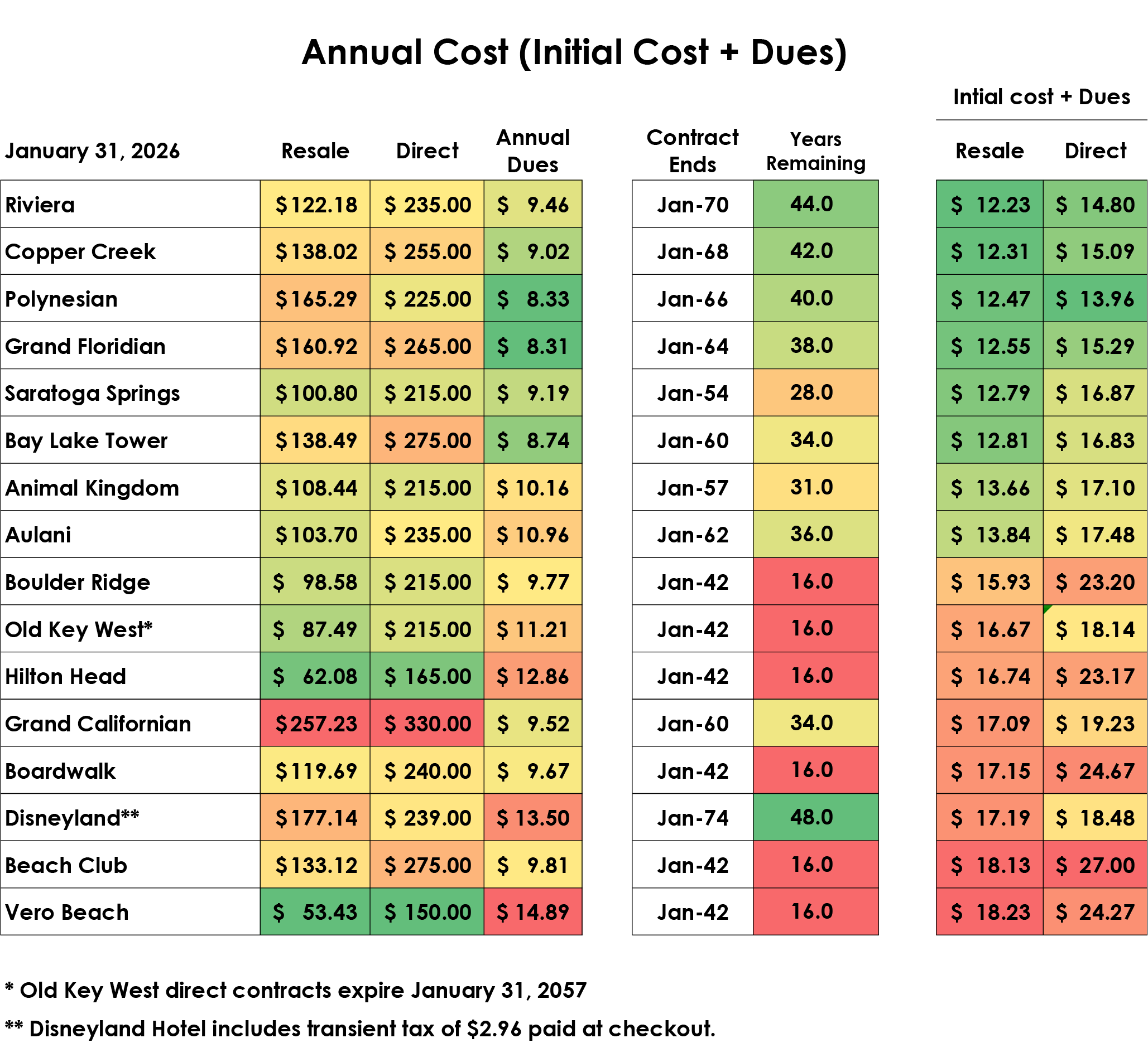 In December, the best resorts for resale purchases, based on total costs (including current pricing, annual dues, and remaining contract time), are Copper Creek ($11.74 per point), Riviera ($11.79 per point), Saratoga Springs ($12.09 per point), Polynesian (12.10) and Bay Lake Tower ($12.12). On the other hand, the least affordable resorts are Vero Beach ($17.45 per point) and Beach Club ($17.41 per point. For direct Disney purchases, the best option is the Polynesian at $13.54 per point, while the Beach Club is the most expensive at $26.22 per point.