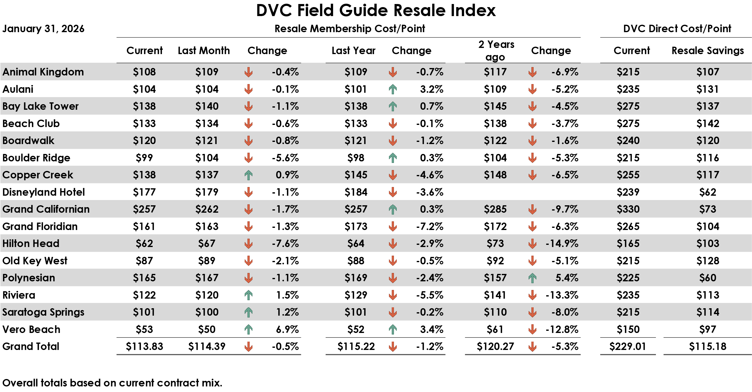 Field Guide Resale Index tracks resale listings from three major resellers. The Resale Index was down 0.5% from last month. In January, the average price per point in the resale market was $113.83 vs. $114.39 in December. A year ago, the average resale price was $115.22, down 1.2%. Two years ago, the price was $120.27, 5.3% decrease. The resale membership cost per point is calculated using the same mix of resort contracts across all periods.
