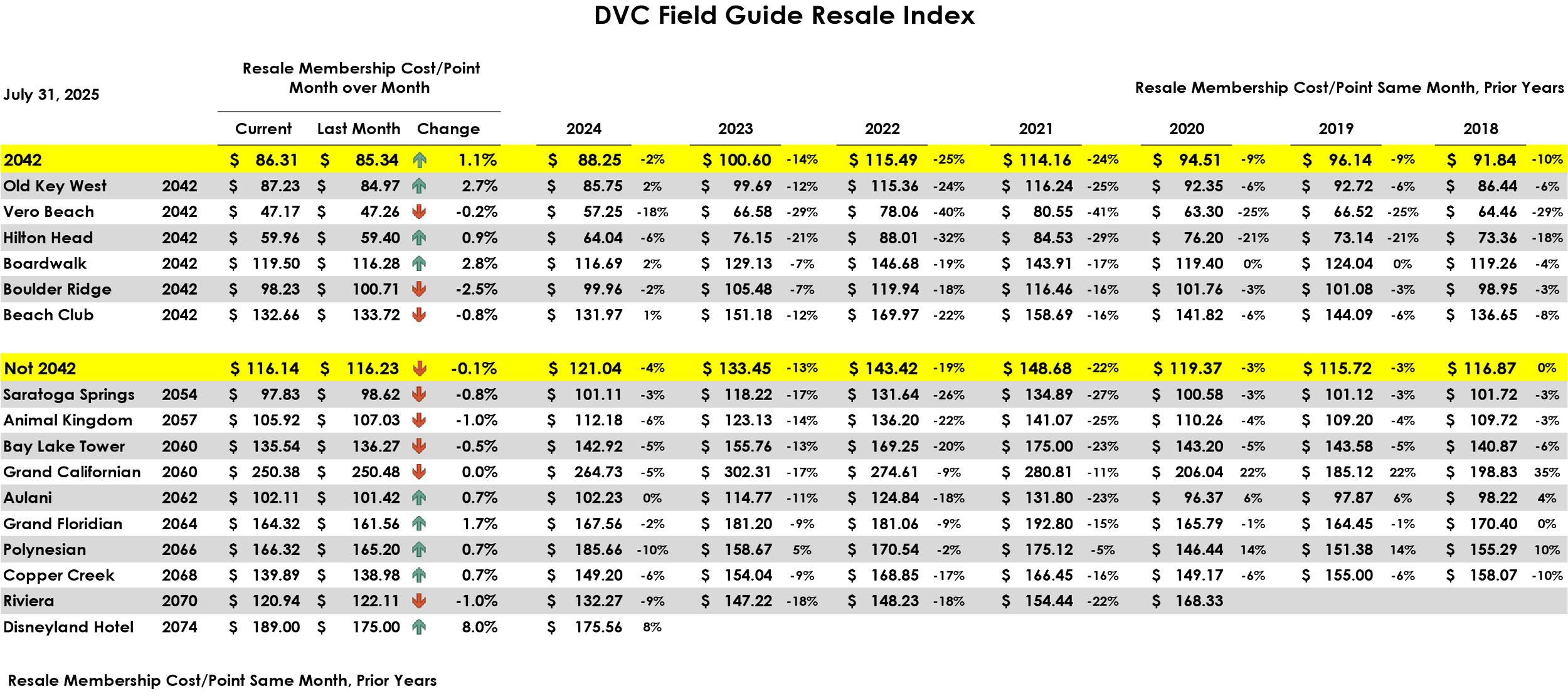 The DVC Field Guide Resale Index tracks resale listings from three major resellers. It reported a slight 0.2% increase from last month. In July, the average price per point in the resale market was $107.21, up from $106.98 in June. A year ago, the average resale price was $111.22, showing a 3.6% decline. Two years ago, the price was $123.49, marking a 13.2% decrease. The resale membership cost per point is calculated using the same mix of resort contracts for each period.