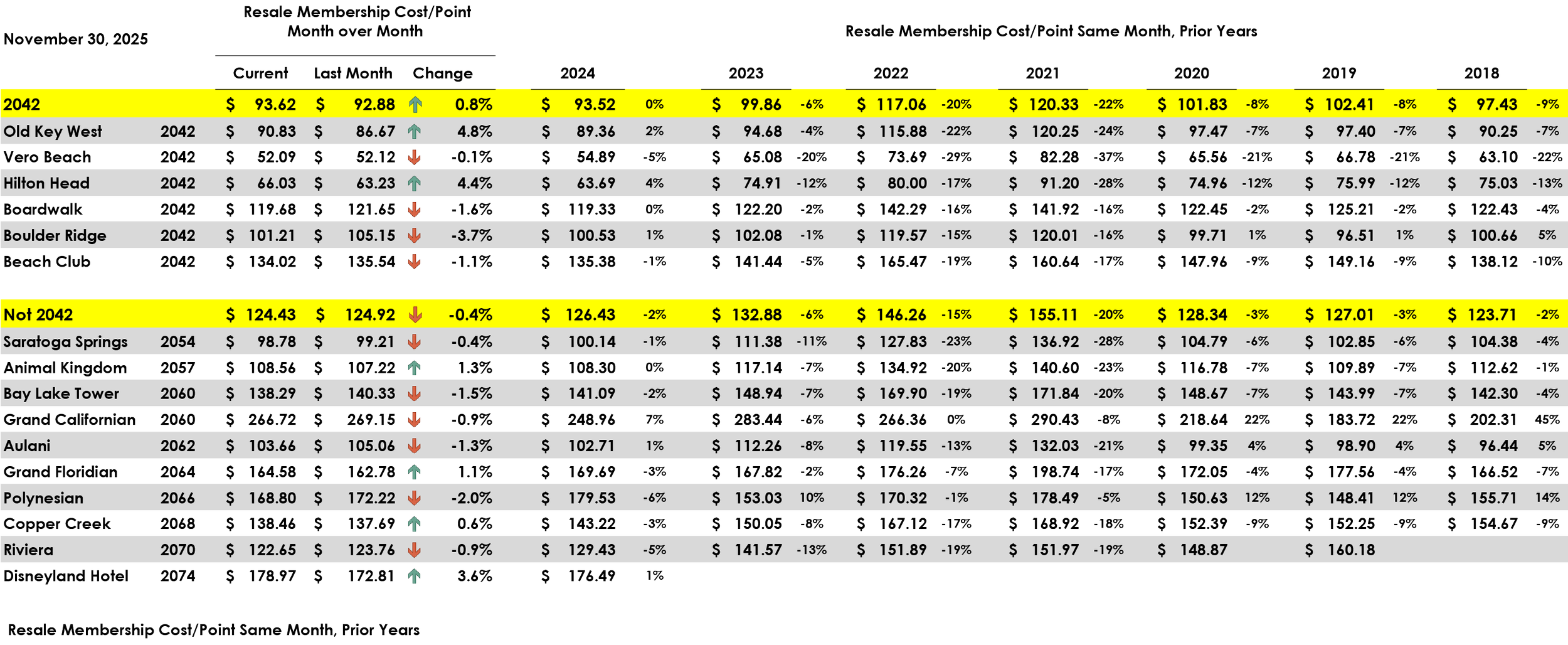 DVC contracts have an end date. The first DVC properties will end their contracts in 2042. Over time, these contracts are expected to decrease in price faster than other DVC properties. However, in November, contracts ending in 2042, compared to the previous month, increased in value by 0.8%. Non-2042 contracts saw an decrease of .04%. Looking back a year, contracts ending in 2042 are flat with the prior year, while non-2042 agreements have fallen by 2%.