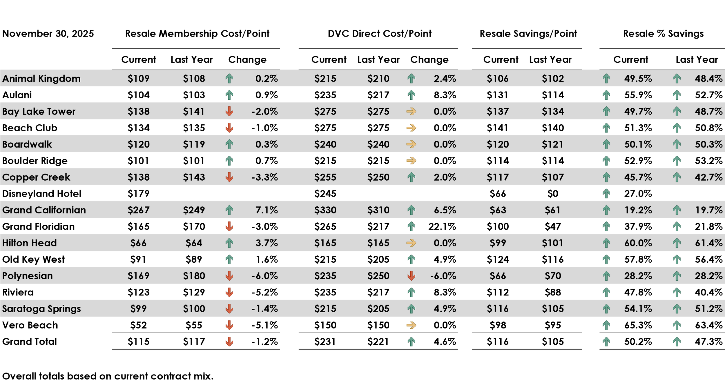 In November, the best resorts for resale purchases, based on total costs (including current pricing, annual dues, and remaining contract time), are Copper Creek ($11.77 per point), Riviera ($11.83 per point), Saratoga Springs ($12.05 per point) and Bay Lake Tower ($12.06). On the other hand, the least affordable resorts are Vero Beach ($17.52 per point) and Beach Club ($17.41 per point. For direct Disney purchases, the best option is the Polynesian at $13.53 per point, while the Beach Club is the most expensive at $26.13 per point..