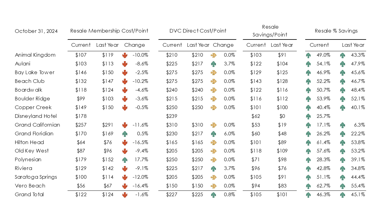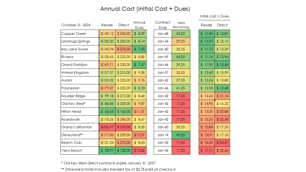 The second table compares the "total" cost of a resort annually. A resort may have a low initial cost but a high annual dues cost. A simple economic valuation considers the initial purchase price and yearly dues cost. The analysis is calculated by taking the initial contract+'s current cost and dividing it by the remaining years on the DVC contract to give some value to DVC resorts with longer contract end dates. The amount represents the initial purchase's annual cost, and by adding the current yearly dues cost/point, you get an average annual value comparable to other resorts. For October, the most economical resorts for a RESALE purchase are Copper Creek ($11.54/point), Saratoga Springs ($11.57/point), and Bay Lake Tower ($11.73/point). Vero Beach ($17.11/point), Beach Club ($16.25/point) and Grand Californian ($15.84/point) are the least economical. For a DIRECT DISNEY purchase, the best resort is Grand Floridian ($13.43/point), with Beach Club being the worst ($24.57/point)