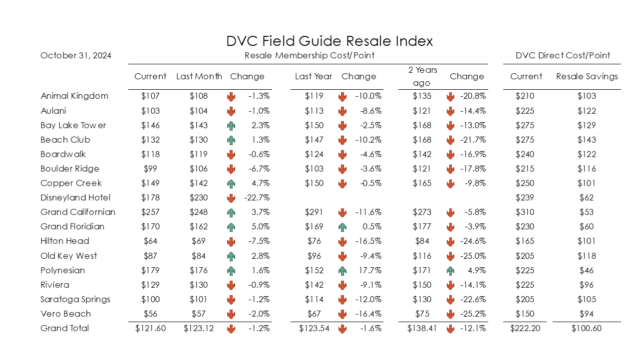 DVC FIELD GUIDE RESALE INDEX (a snapshot of DVC resale listings at three top resellers) was slightly lower at -1.2% compared to last month. The average price/point on the resale market was $123.12 in September, decreasing to $121.60 in October. A year ago, the price resale index was $123.53, a 1.6 % drop. Two years ago, the index was at $138.41, a 12.1% drop.