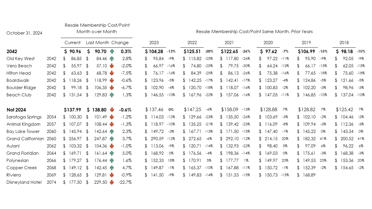 DVC properties with a 2042 contract end date had an average increase of 0.3% from last month. Due to the lack of remaining years on the contract, the value of these contracts is expected to be accelerated. Non-2042 contracts also showed a decrease in value of 0.6%. Compared to a year ago, 2042 Contracst have dropped 13.0% while non-2042 Contracts have increased slightly.