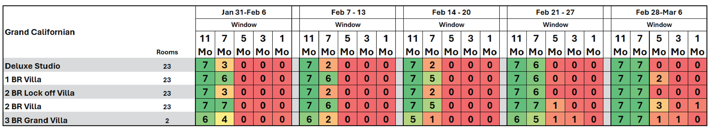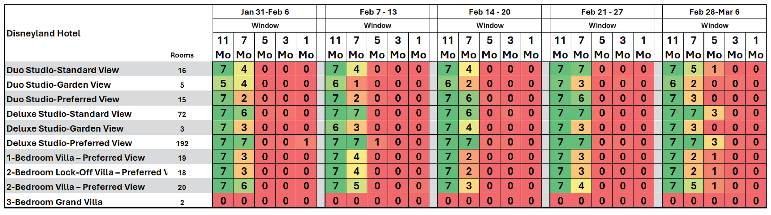 The tables below illustrate the average number of consecutive days available for booking a designated accommodation over a week, based on data collected over the past seven years. These availability figures align with what is displayed when searching for a unit on the DVC website. To make the data easily interpretable, a traditional red-and-green light format is used: green indicates the highest availability, while any number below 7 indicates limited availability and signals caution. A total of seven means that every day of the week is available for booking.