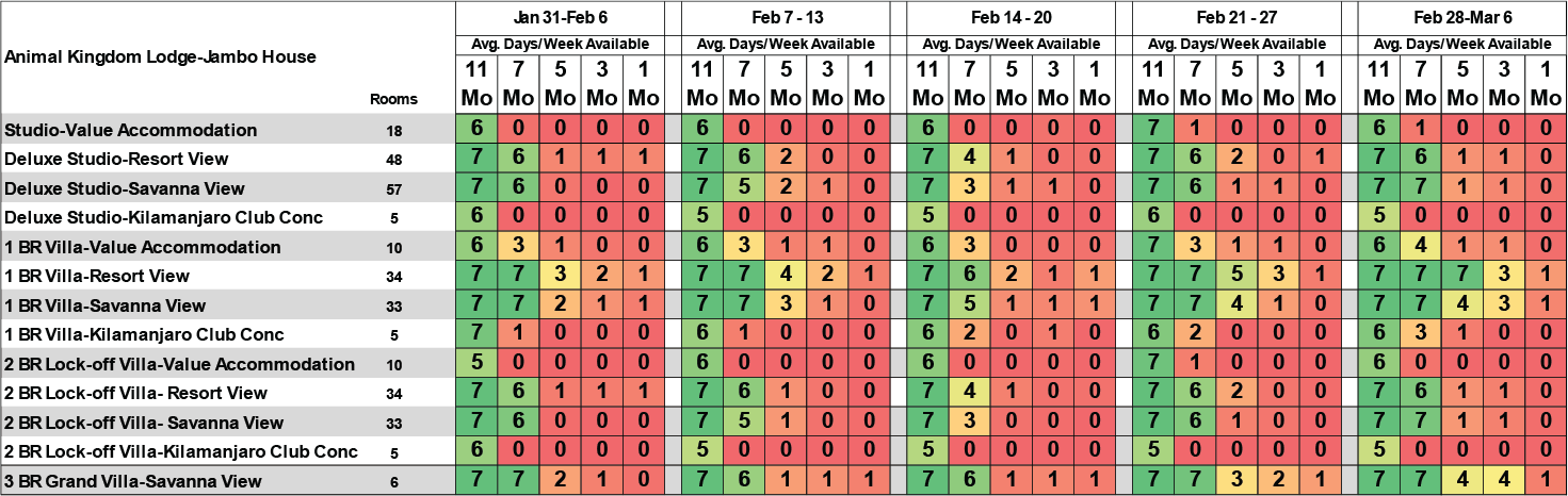 The tables below illustrate the average number of consecutive days available for booking a designated accommodation over a week, based on data collected over the past seven years. These availability figures align with what is displayed when searching for a unit on the DVC website. To make the data easily interpretable, a traditional red-and-green light format is used: green indicates the highest availability, while any number below 7 indicates limited availability and signals caution. A total of seven means that every day of the week is available for booking.