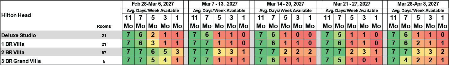 Hilton Head Island should have week availability for most studios/Villas at the 11-month windows.