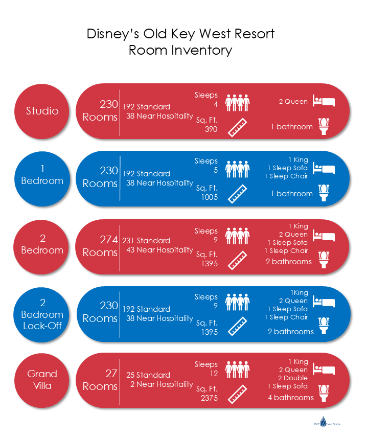 Two-Bedroom Villas are three-room units. Two-Bedroom units at Old Key West Resort are either lock-offs (made up of connecting Studios and One-Bedroom units) or dedicated units. Both unit types sleep nine. There are 230 lock-off units and 274 dedicated units. The units are 1,395 square feet, the largest of any Two-Bedrooms Villas at DVC.