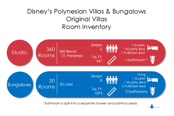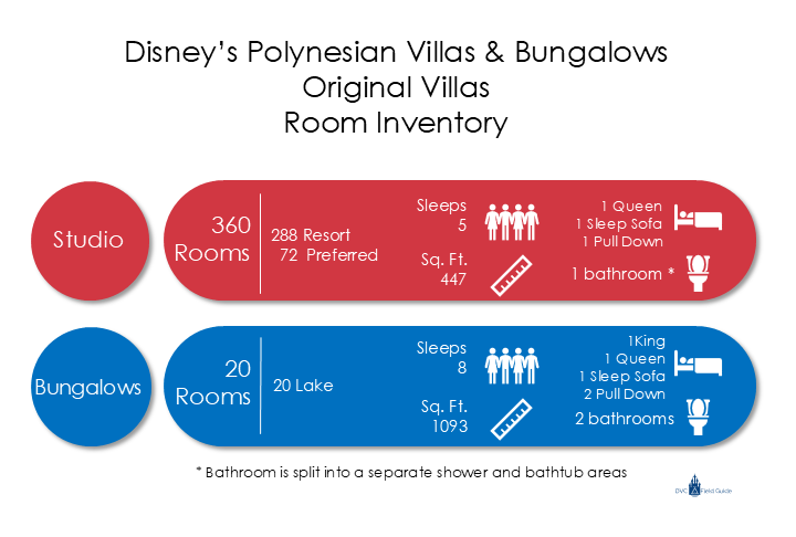 Disney's Polynesian Villas and Bungalows opened on April 1, 2015, by converting rooms in three existing longhouses from the original Polynesian Resort into 360 Deluxe Studios. Also, 20 over-the-water Bungalows built over Seven Seas Lagoon were added to the resort. The complex is themed after the South Pacific and includes rooms in 11 longhouses, each named after a Pacific island. The three longhouses that were converted to DVC Studios are Tokelau, Moorea, and Pago Pago. The Studios at Polynesian Villas are the largest Deluxe Studios on any DVC property at 447 square feet and feature a split bathroom. The Bungalows sleep up to 8 but require the most points of any non-Grand Villa unit. The accommodation offerings are the least diverse of any DVC resort. There are only Studios and Bungalows at the resort, no one, two, or Three-Bedroom units.