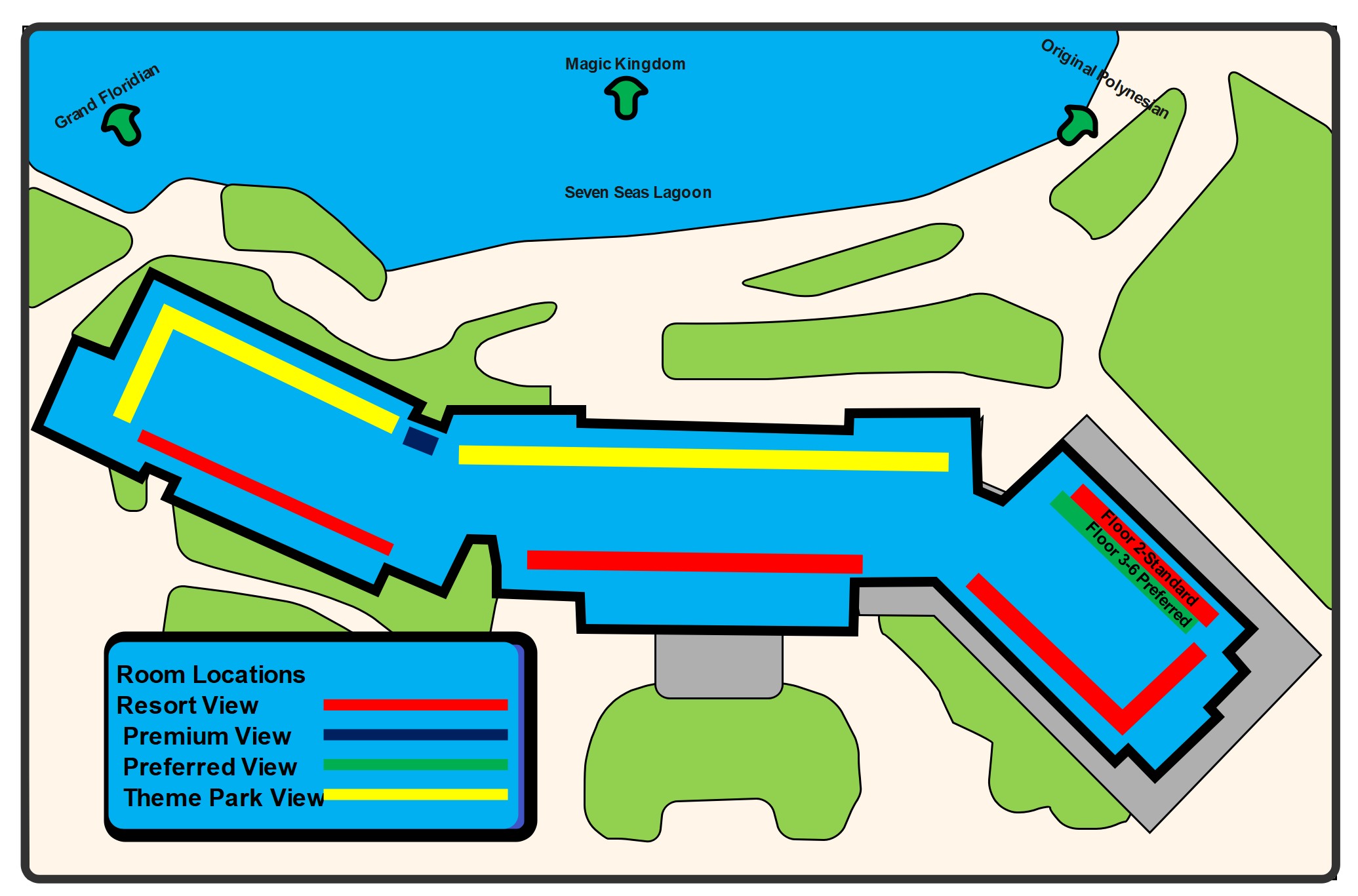 The standard view units are located in Tokelau, Pago Pago, and the non-lagoon side of Moorea longhouses. The lake view locations are on the lagoon side of Moorea. The Transportation and Ticket Center is located beside the Moorea and Pago Pago longhouses for easy access to the Epcot monorail and the boat to the Magic Kingdom.