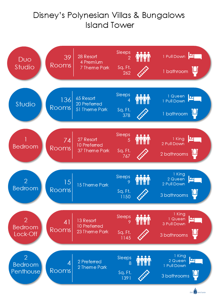 he Island Tower’s deluxe studios boast a refreshing and modern layout, featuring a cozy seating area that invites relaxation and conversation, situated just across from the well-appointed kitchenette. Each studio is thoughtfully equipped with a plush Queen Bed and a versatile Queen-Size Pull-Down Murphy Bed, providing ample space for up to four adults to unwind and recharge. In addition to the inviting sleeping arrangements, these spacious accommodations offer a full bathroom , along with a kitchenette that includes a microwave, a compact refrigerator, and the a dishwasher, the only DVC Studio with one. These rooms are 378 square feet.